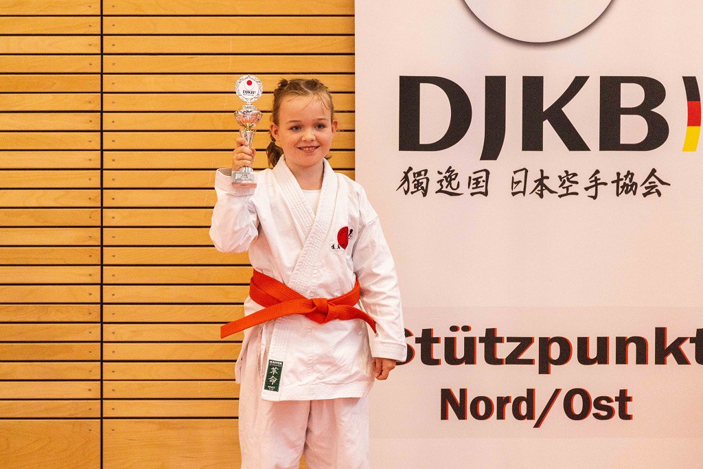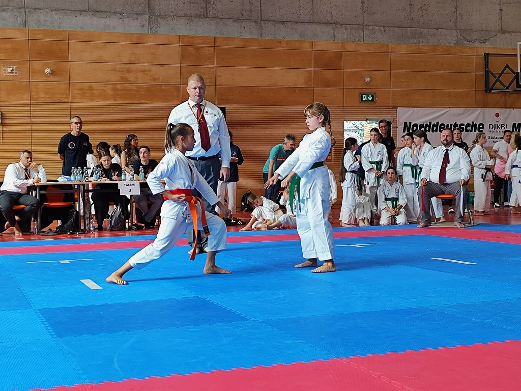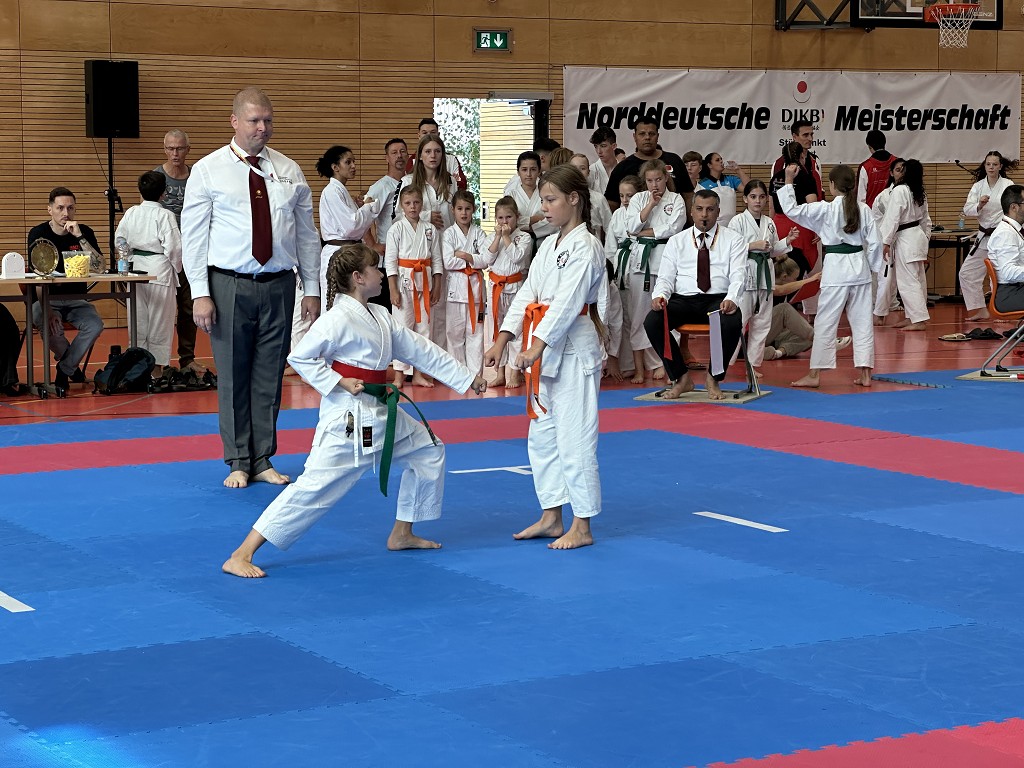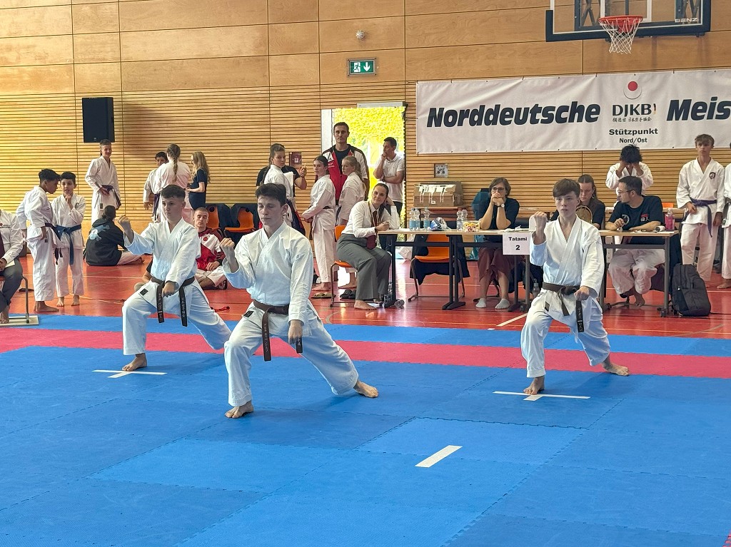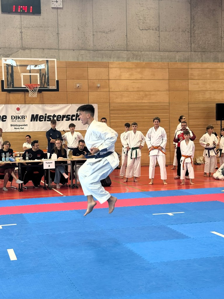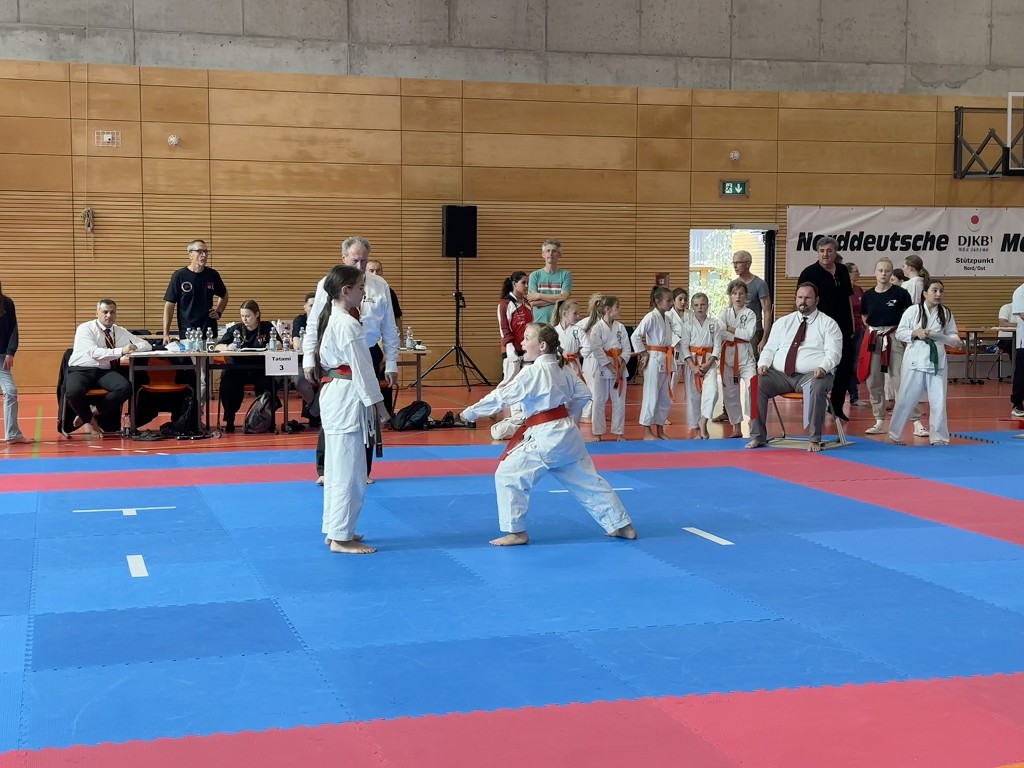 Nach der Sommerpause reiste der āHatsuun Jindoā Karate-Club Magdeburg-Barleben e. V. am vergangenen Samstag (20.09.2025) mit gleich 37 Startern zur Norddeutschen Meisterschaft des DJKB an. Sie reihten sich ein in ein Feld von über 300 Karatekas aus 36 Vereinen, die überwiegend aus dem Norden Deutschlands nach Hannover kamen. Unter den Startern des HKC waren auch einige sehr aufgeregte Kinder, die ihren ersten Wettkampf an dem Samstag bestritten. Zu Ihnen gehƶrte Finja Thierbach, die sich am erfolgreichsten schlug. Mit einer Ruhe, die üblicherweise erst mit jahrelanger Erfahrung einhergeht, meisterte sie Runde um Runde und sicherte sich im Kata-Finale der neun- bis elfjƤhrigen mit einer technisch überzeugenden Heian Nidan die Bronzemedaille ā ein wunderbarer erster Erfolg. In der gleichen Gruppe schaffte es ihre Teamkollegin Leona Grasme ebenso ins Finale. Auch für sie war es der erste Wettkampf und die Aufregung groĆ, doch die lieĆ sie sich nicht anmerken. Leona belegte mit ihrer kraftvollen und dynamischen Kata den vierten Platz.