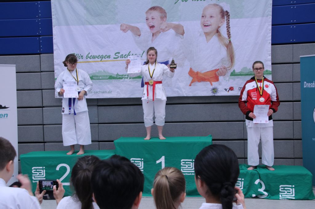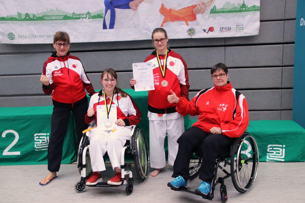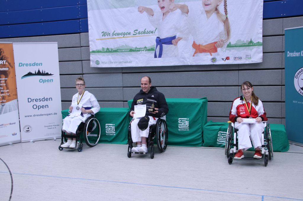 Nicht nur der Name „Magdeburg“ sondern auch „Sachsen-Anhalt“ stand erstmalig auf den Starterlisten im Para-Karate bei den Dresden Open. Über viele Jahre haben sich hier schon einige Kämpfer ausgetestet, allen voran Sven Baum aus Thüringen, welcher in der Disziplin Kata in seinem Rollstuhl einfach unschlagbar ist. Aber Lani Markwort wollte es dieses Jahr wissen. Mit ihrem gelben Gürtel war sie noch ein absoluter Frischling, musste jedoch gleich richtig ran mit ihrem Rollstuhl. Doch die hochgraduierten Rollstuhlfahrer machten sie nicht weiter unruhig. Sie fand es einfach toll dabei zu sein. Mit einer gewissen Ruhe rollte sie an die Kampffläche und gab ihr Bestes. Mit ihrer „Heian Shodan“ erkämpfte sie sich die Bronzemedaille.